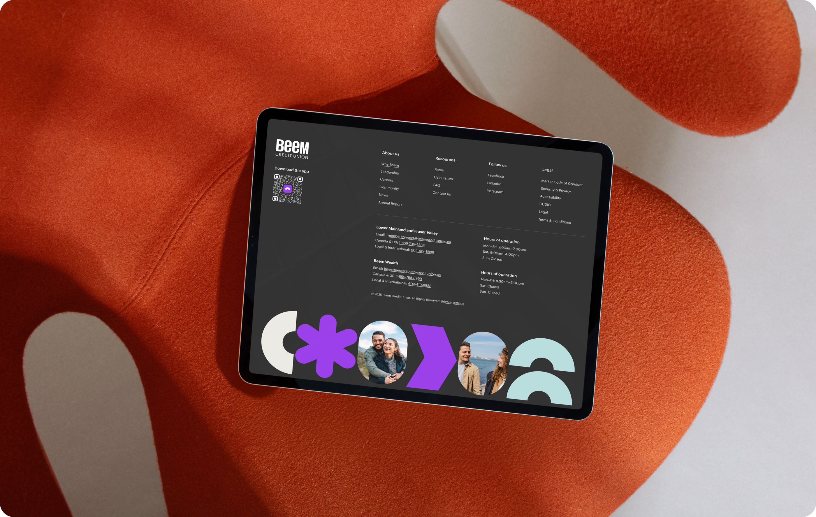 Beem comes to life with motion and interaction, guiding users through the site without friction. We used subtle animation to draw attention to key content while also articulating the brand’s accessible personality. The bold color palette offers wayfinding for Beem’s customer segments – personal, business, and wealth – while distinct shapes, patterns, and imagery create a unified user experience from page to page, for purposeful familiarity.