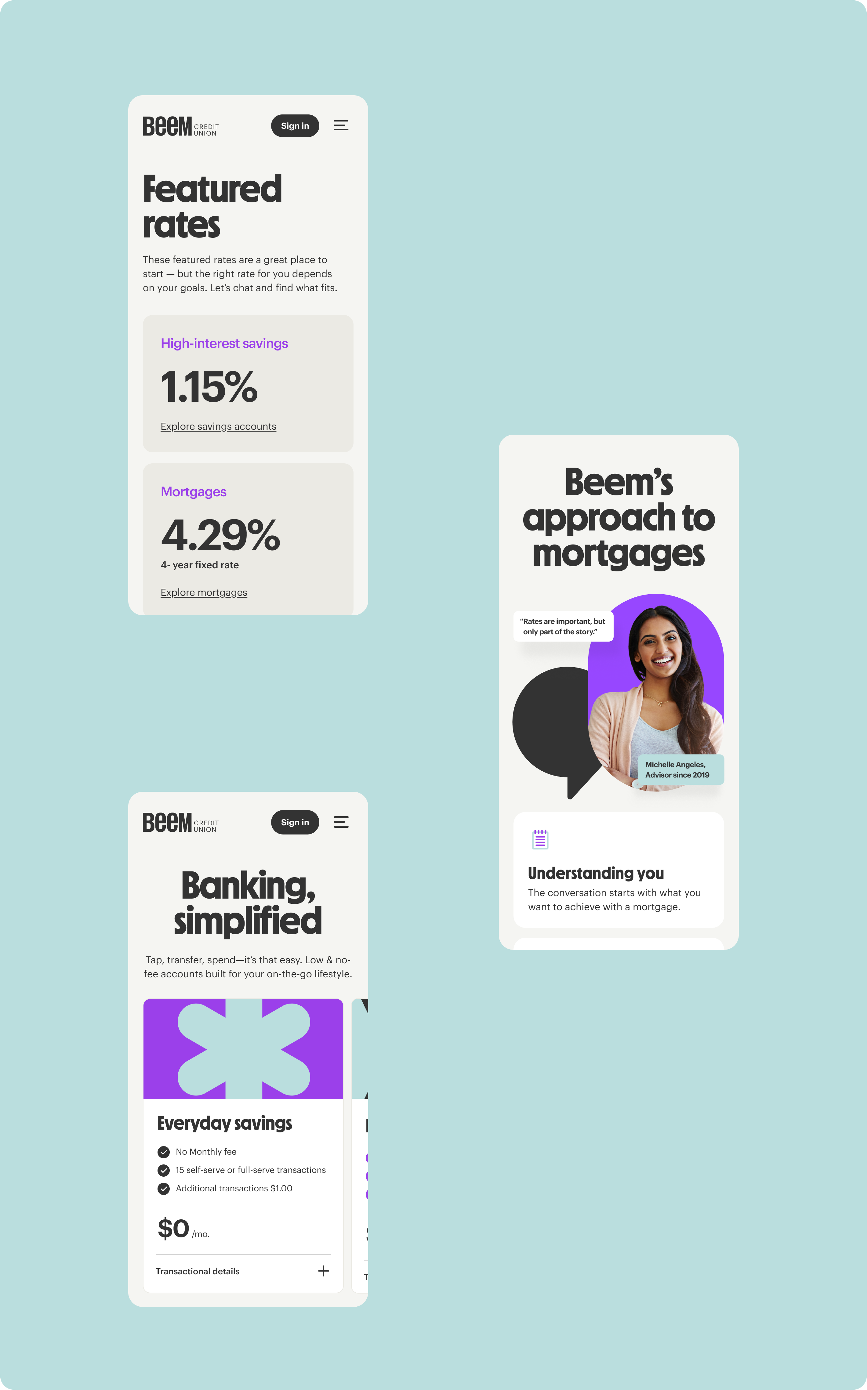 We set up Beem to deliver content at scale across a flexible UX system and a conversational approach to copy, offering an intuitive experience for existing members and prospective customers alike. Communicating the depth of financial products and services can be messy – instead we focused on reaching clarity by taking a thoughtful approach that guides users through storytelling and compelling brand visuals.
